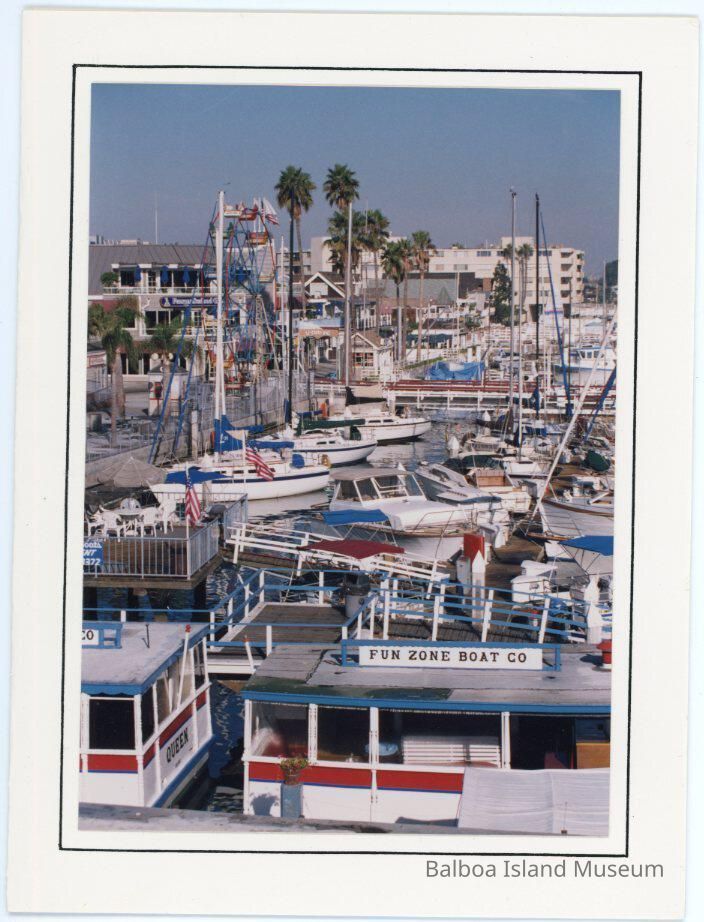 A notecard with a color photograph adhered to the front. The photograph is of the docks along the front of the Fun Zone including the Ferry dock and the docks for the Fun Zone Boat Co. who owned the Queen and another tour boat. The Ferris wheel is visible on the left and the U-Drive sign is just behind it.