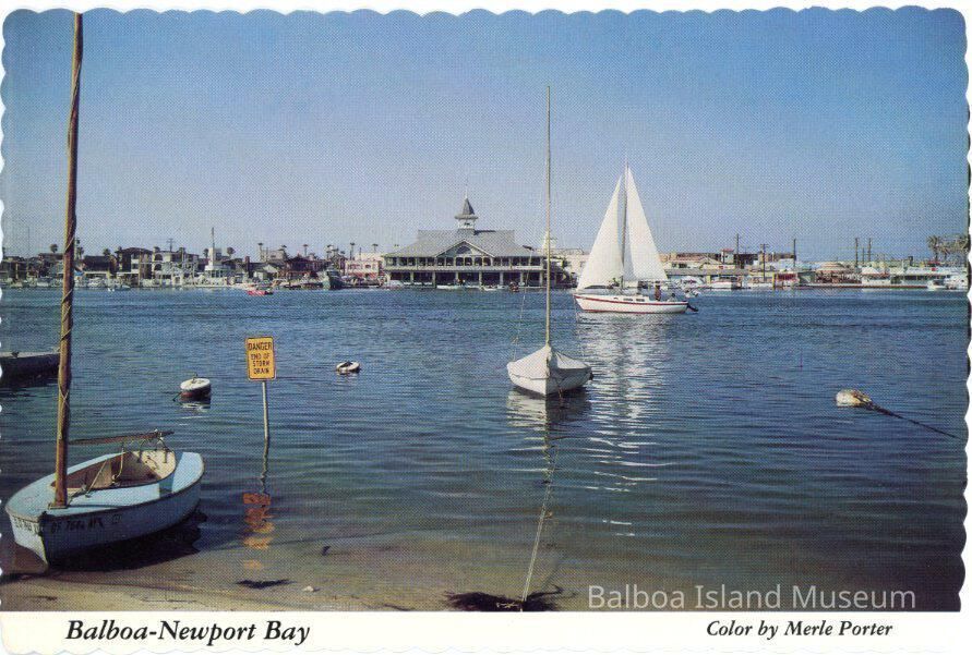 A photograph taken from Balboa Island of the Balboa Pavilion with a white sailboat ready to pass in front of it. There's a storm train warning sign in the water and a blue sailboat pulled up onto the shore. Scalloped edge. White banner along the bottom with the title and photographer.