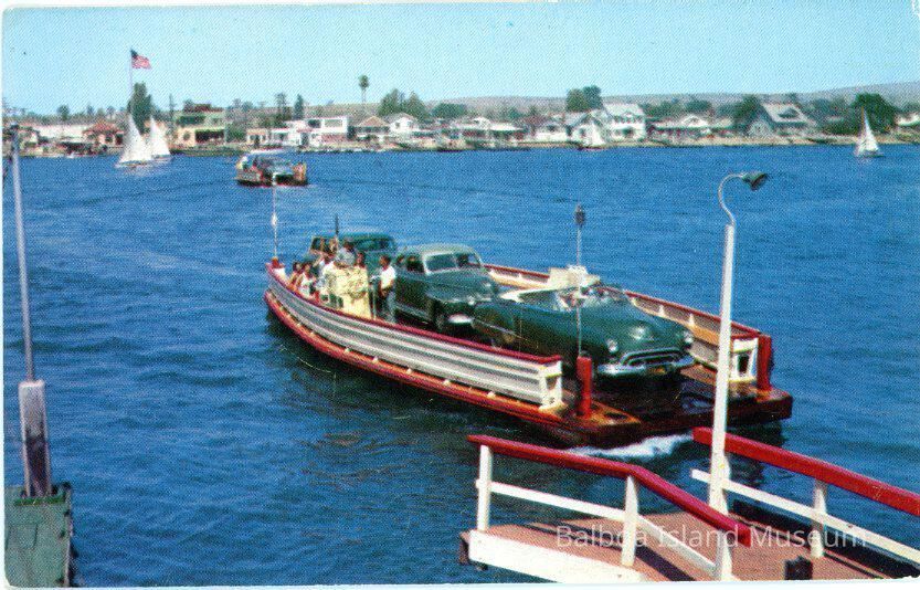 A color photograph postcard featuring an image of the Balboa Island Ferry drawing into the dock on the Balboa side of the harbor. A second ferry is visible heading towards Balboa Island in the background.