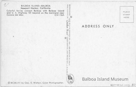 Never sent. The back includes a small blurb about the Balboa Island Ferry. Published by Golden West, made by H. S. Crocker Co., Inc. The photograph was taken by George Elton Watson, copyright 1957. Post card number GW-156A. Stamp box reads "Place Stamp Here' inside a solid border.Subject