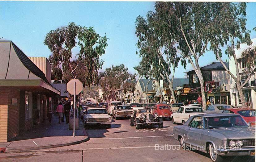A color postcard looking up Marine's 300 block towards Irvine Terrace Taken from the corner in front of what was Persimmon Tree/Debrah Huse gallery (originally the Shell Gas Station). The first building on the left now houses balboa Island Candy and was once Norton's Hardware store.