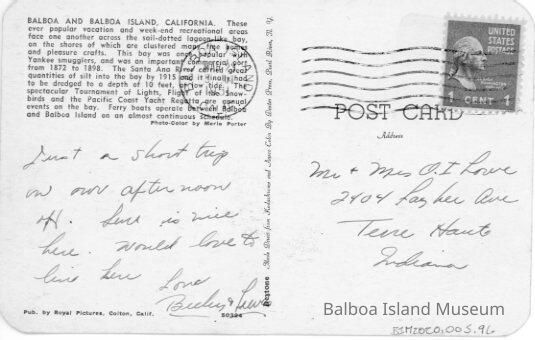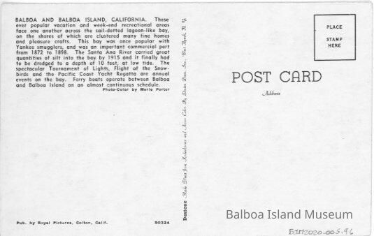 Two copies, one sent and one never used. One of the postcards also has rounded edges. Both have a blurb on the back about Balboa, Balboa Island, and the Newport Harbor. The photograph is by Merle Porter, published by Royal Pictures and printed by Dexter Press. Postcard number 50324.Subject