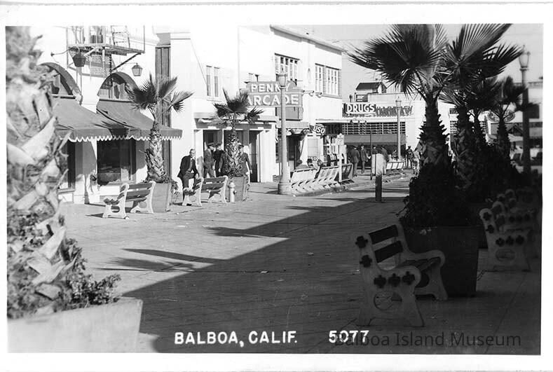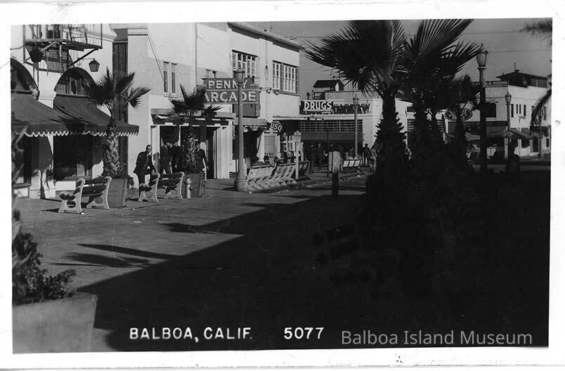 A black and white photograph postcard taken near the intersection of Main Street and Balboa Blvd. A penny arcade and a drug store can be seen across the pedestrian boardwalk from the photographer. The pedestrian boardwalk seen here is now an extension of Main Street with the balboa pharmacy visible across the street from the other drug store. The Penny Arcade Building is now a parking lot. Two copies, one is a darker exposure than the other and slightly cropped.
