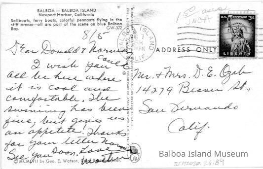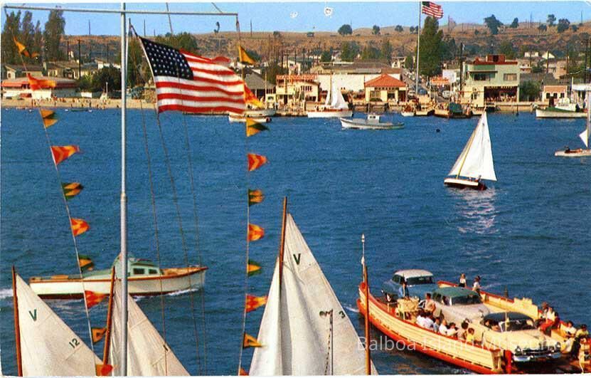 A photograph postcard of the Balboa Island ferry landing across the bay on Balboa island with the Balboa ferry visible in the lower right corner coming in to dock on the Balboa Peninsula. Taken in 1957.