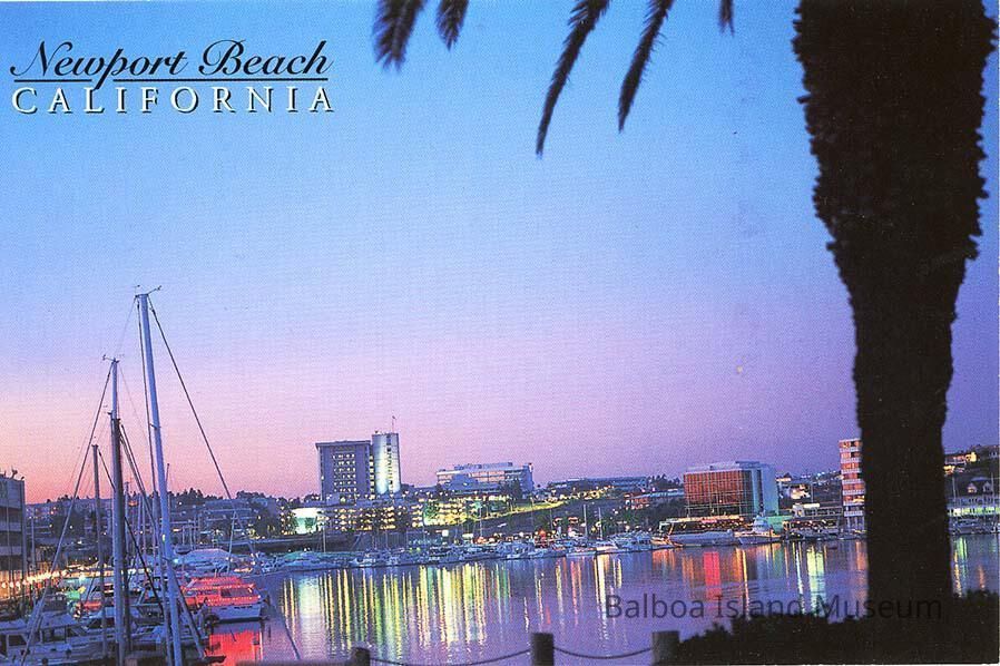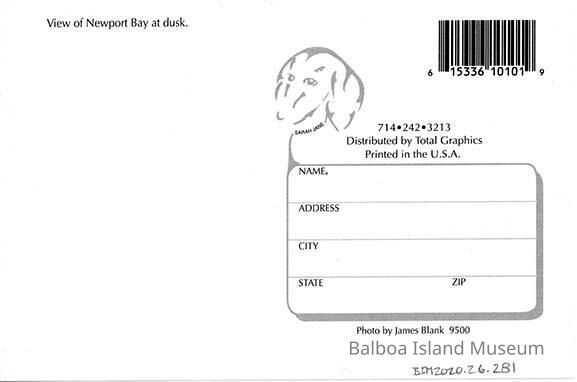 A color postcard with a photograph of the sunset over Newport Beach. Hoag hospital is the large tower in the center. Likely taken from the north end of Lido Park on the beach side on the opposite side of Via Lido drive from the main body of the park (chain fence and palm tree can be matched along with other buildings).