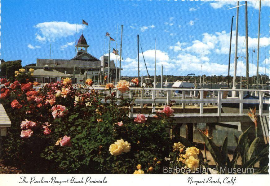 A color postcard of the Balboa pavilion taken from inside someones yard with a line of rosebushes visible across the photograph. Taken from east of the pavilion. Scalloped edges.