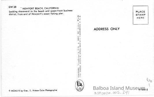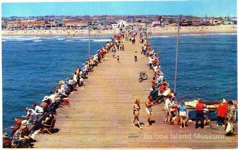 A color postcard of fisherman gathered along the Newport Beach pier and others walking up and down the pier. Looking towards shore from the old loading platform at the end of the pier, which is now a fish preparing area.