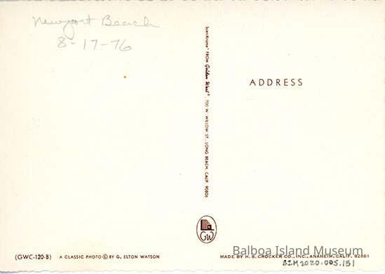 The back is a standard postcard back, unused. The words "Newport Beach, 8-17-76" are written on the back in pencil; this might be purchase date and location information from the original owner. Photograph by George Elton Watson, published by Golden West and printed by H. S. Crocker Co., Inc. Postcard number GWC-120-B.Subject
