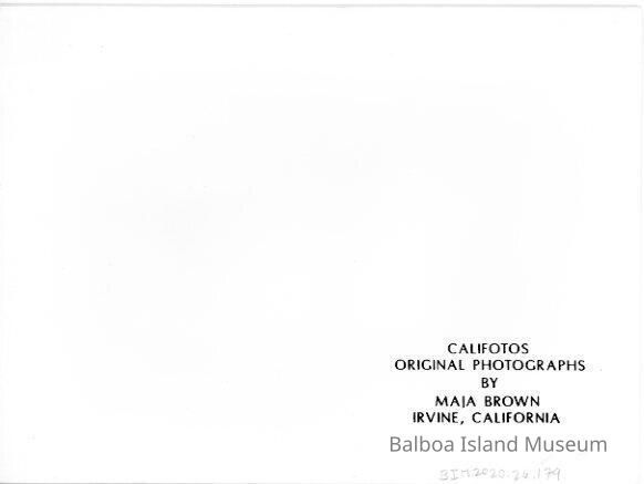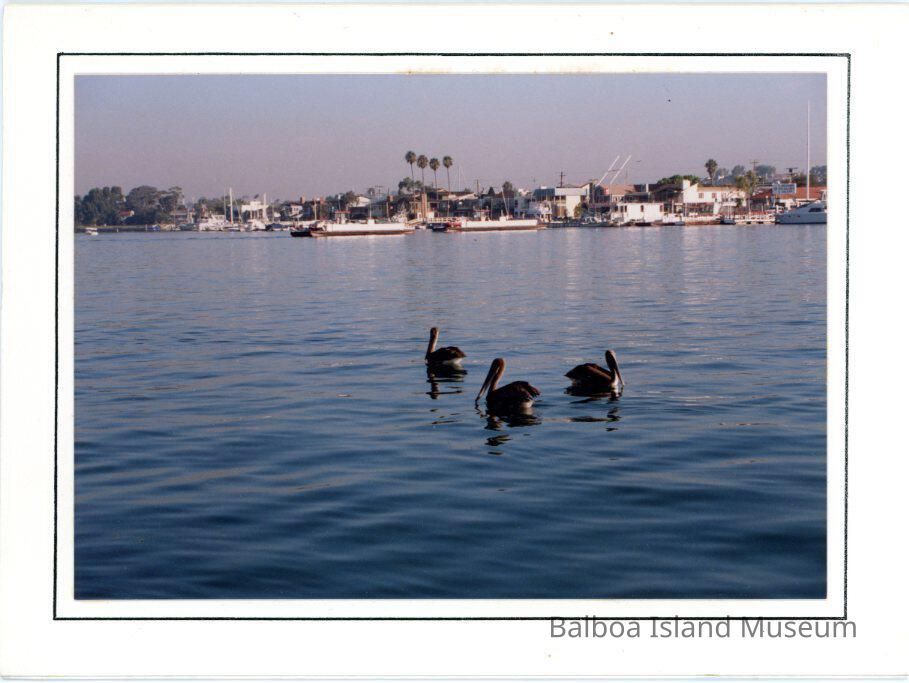 A white note card with a photograph of three pelicans floating on the water while two Ferry's pass behind them. Balboa Island is on the right. Photograph by Maja Brown. A Califoto original photograph. The photograph is a print adhered to the front of the card inside a black frame box.Collection
