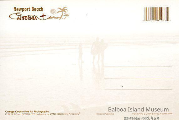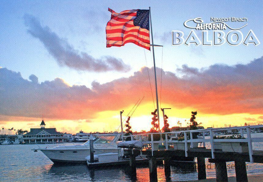 A color photograph postcard of the Pavilion and the dock at 526 South Bay Front with a boat moored in place. Taken at either sunrise or sunset. Newport Beach California is written in the upper right corner in white and "Balboa" is printed below in translucent bubble letters.