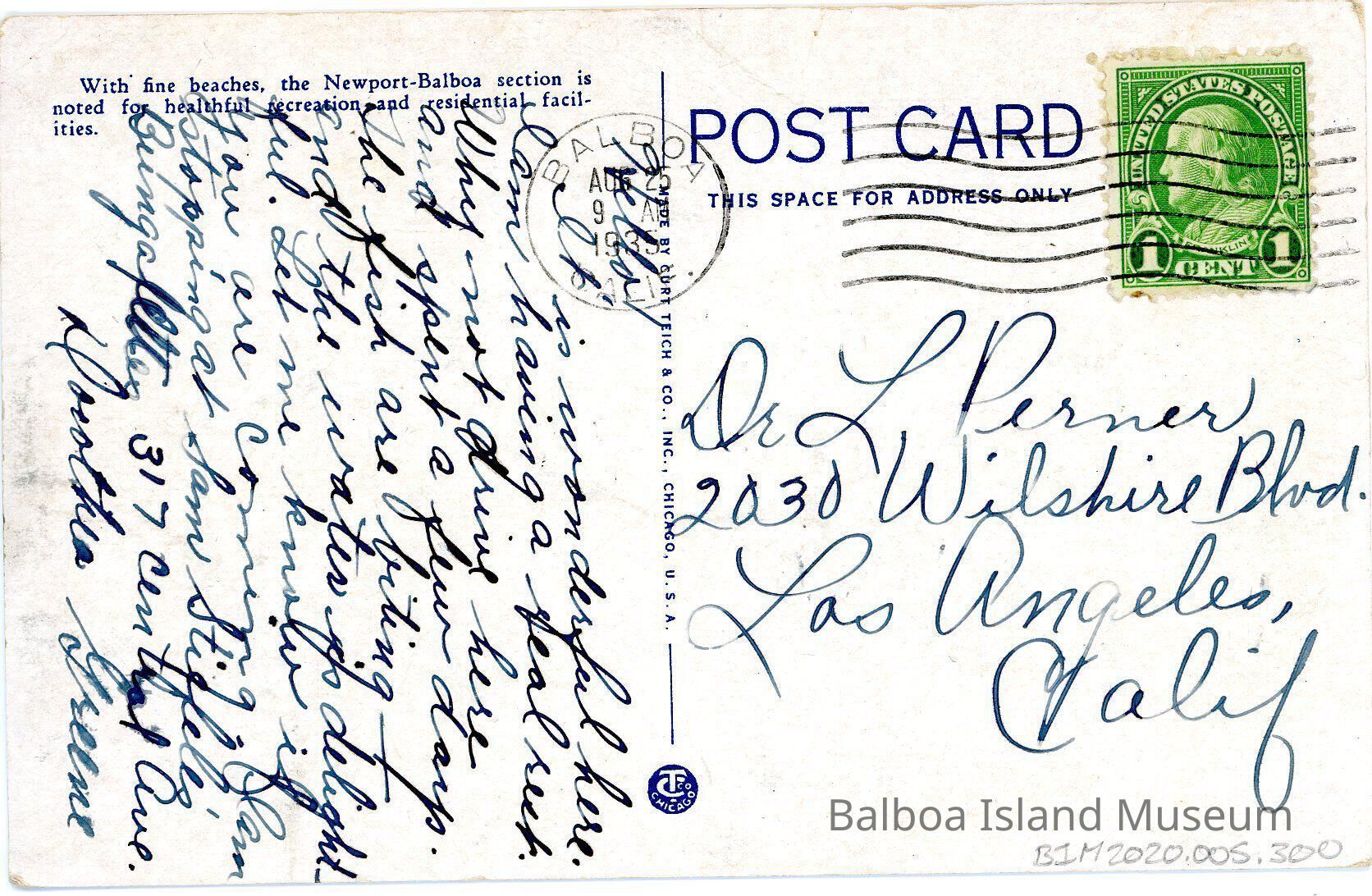 One sent on August 25, 1935 and one unused. The sent one was maled from Balboa to Los Angeles and is addressed to Dr. L. Perner from Dorothea Greene. Printed by Curteich-Chicago. Postcard or image number 1A905.Subject