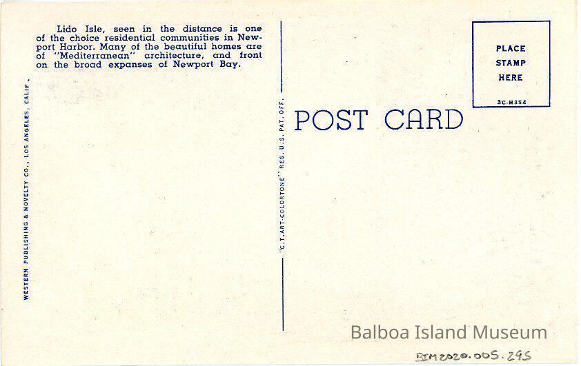 Unused. Published by Western Publishing & Novelty Co. and printed by Curteich-Chicago. Postcard or image number N-26. Printer number 3C-H354 inside stamp box. Linen postcard. Small paragraph about Lido Isle on the back.Subject