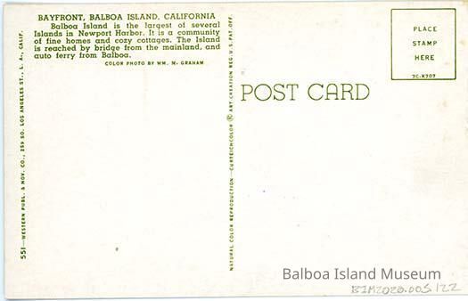 Two copies, neither sent nor used. The back is a standard layout with a small blurb in the upper left corner about Balboa Island. Photograph by William M. Graham, published by Western Publishing & Novelty Company, and printed by Curteich Color (Curteich-Chicago). The postcard numbers are 551, 7C-K707. Printed in 1957 using a color transparency and a four-color process. The finished card was coated with plastic over the image.Subject