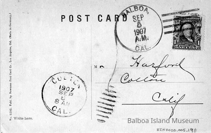 The post card was sent September 5, 1907 to Mr. Hazford. The Town the postcard was addressed to is difficult to read and may no longer exist. It might be Colton. Published by Newman Post Card Co. in Los Angeles. Made in Germany. Postcard number 5292.Subject