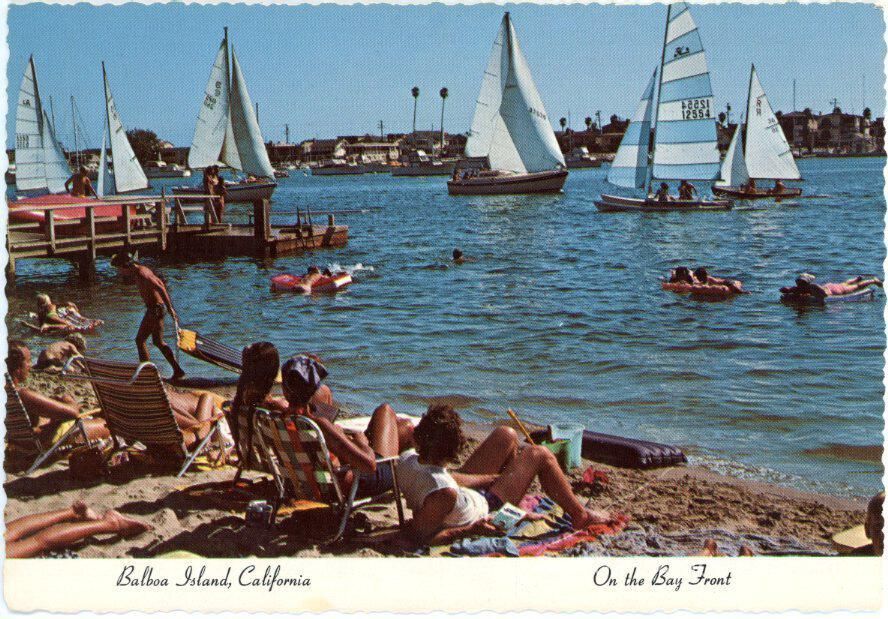 A photograph of several sailboats in the harbor and part of the South Bay Front beach with people watching the boats sail by from the beach. White boarder on the bottom with ""Balboa Island, California"" in the left corner and ""On the Bay Front"" in the right corner. Scalloped border