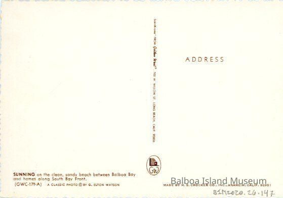 Unused. Small blurb in lower left corner. Published by Golden West, printed by H. S. Crocker Co., Inc in Anaheim. Photograph by George Elton Watson. Postcard number GWC-179-A.Subject