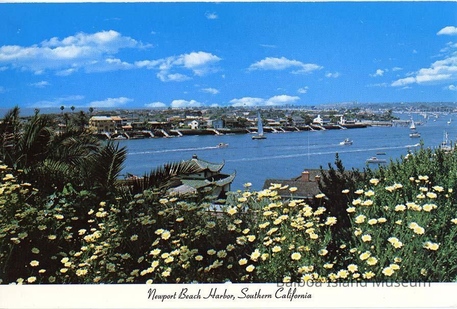 A color photograph postcard of Newport Beach harbor taken from Inspiration Point. Wild daisies and other plants are partially block the view of the houses below, but the China House roof is visible.