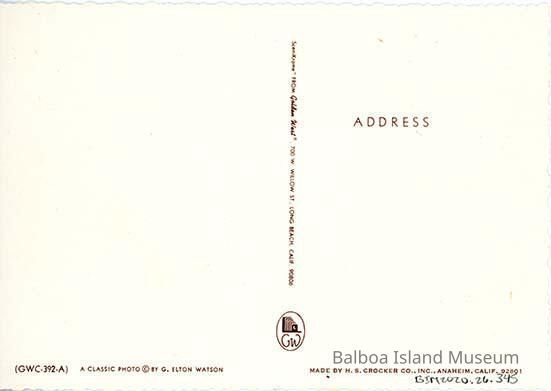 Unused. Published by Golden West, printed by H. S. Crocker Co, Inc in Anaheim. Photograph by George Elton Watson. Postcard number GWC-392-A.Subject