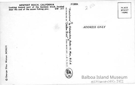 Unused. Published by Golden West in Long Beach and printed by Colourpicture in Boston. Photograph by George Elton Watson. Postcard number G. W. 317, print number P15006.Subject