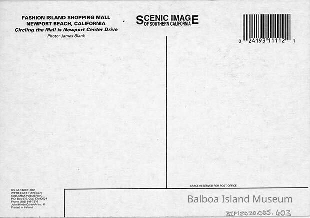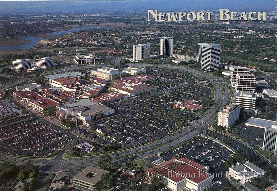 An aerial photograph of the Fashion island Shopping Mall and surrounding buildings taken from over the movie theater. The building which houses Whole Foods has not been build yet.
