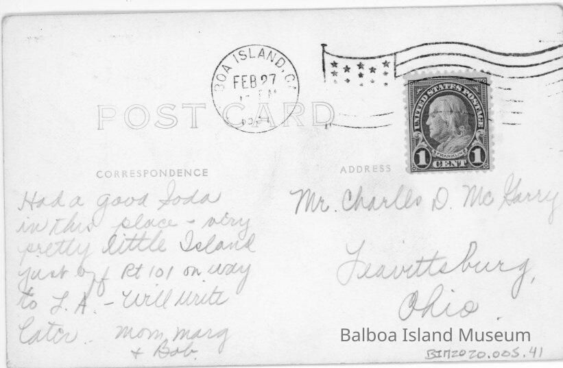It was sent on February 27, 1937 from the Balboa Island post office. It was addressed to Mr. Charles D. McGarry in Leavittsburg, Ohio.Subject