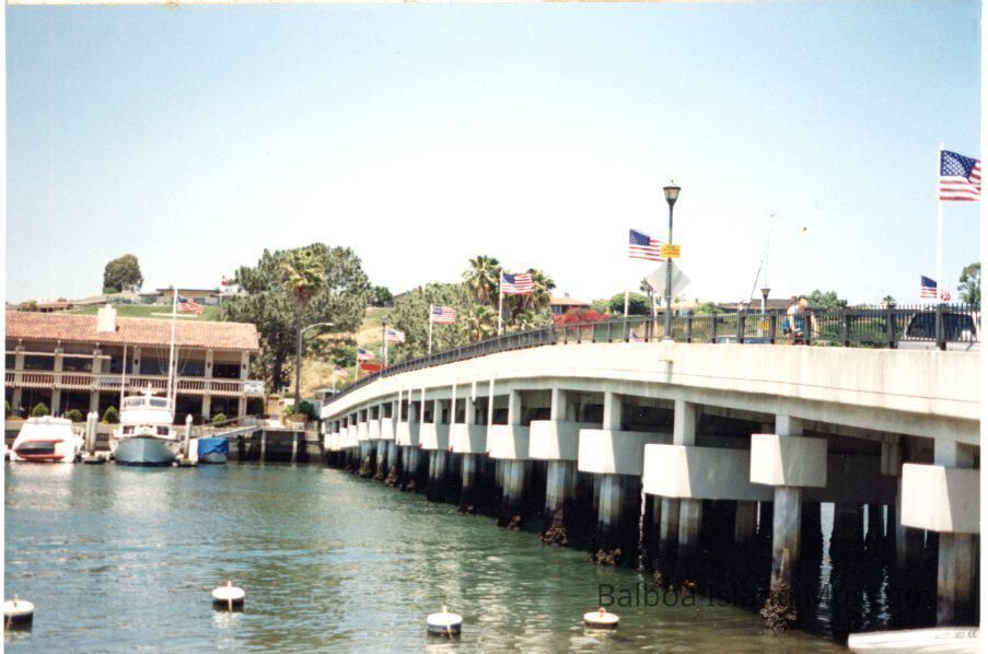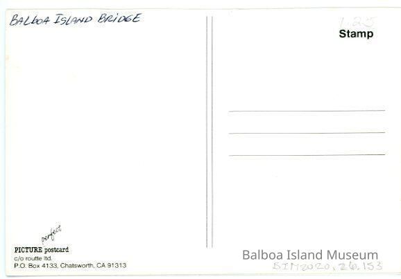 A thick, heavy postcard made locally that appears to be a photograph glued to a piece of backer board. More recent in age. Photograph of the Balboa Island bridge with flags flying taken from the west side of the Bridge. The Newport Beach Yacht Club is across the Balboa Island Channel from the photographer.