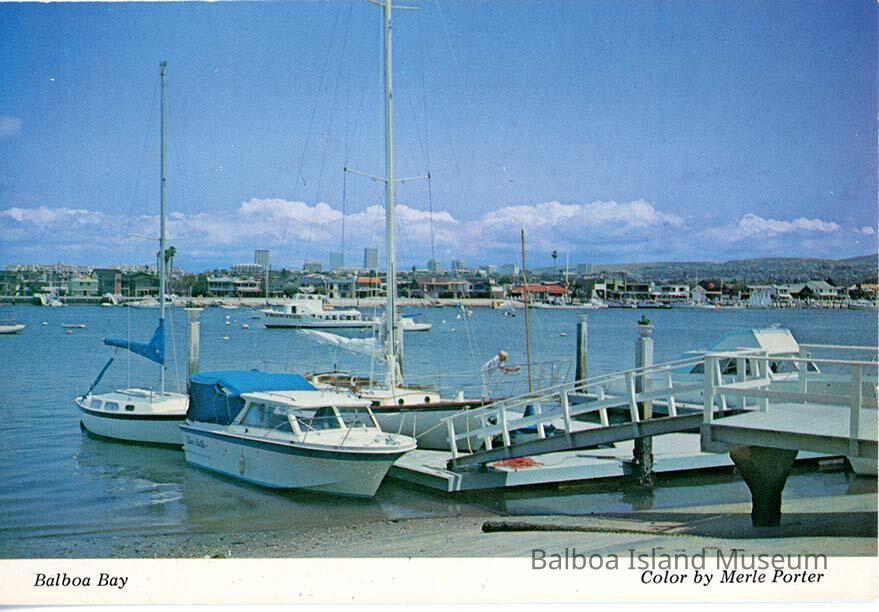 A photograph of Grand canal looking up the canal towards the Irvine Terrace homes. A man is standing on his boat and a woman is on an inflatable raft next to his boat. Taken from the main island side. white boarder on the bottom with title on it.