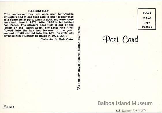 Unused. Divided back. Published by Royal Pictures in Colton. Photograph by Merle Porter. Postcard number C-511, print number 053515.Subject