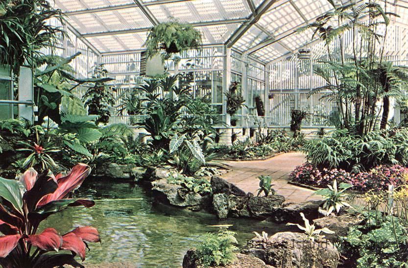 A color photograph postcard of the inside of the greenhouse with the koi pond to the left and the pathways to the right. The garden is housed inside a wood-slat covered building with glass set behind the slats to keep the temperature inside higher for the plants and fish.