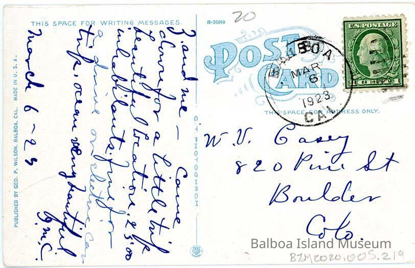 One copy was sent on March 6, 1923 from Balboa, California to W. V. Casey in Boulder Colorado. Both published by George P. Wilson in Balboa, California and printed by Curteich-Chicago. Print number R-35819.Subject