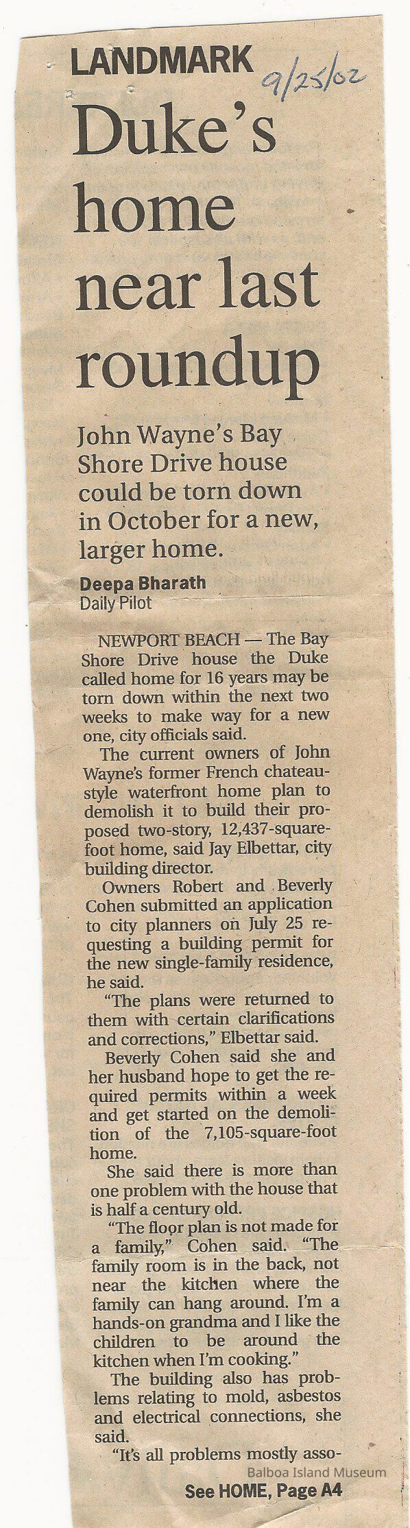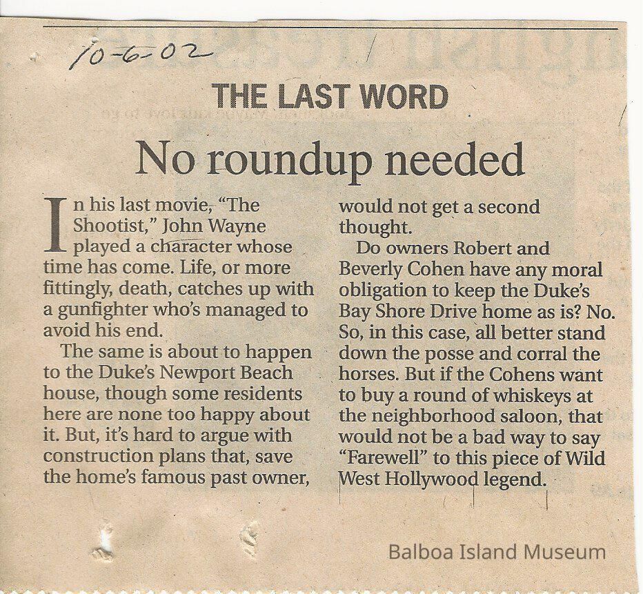 Daily Pilot newspaper clippings dated Sept. 25, 2002 and Oct. 6, 2002. John Wayne's former home was about to be torn down.Collection
