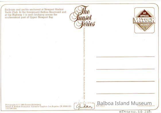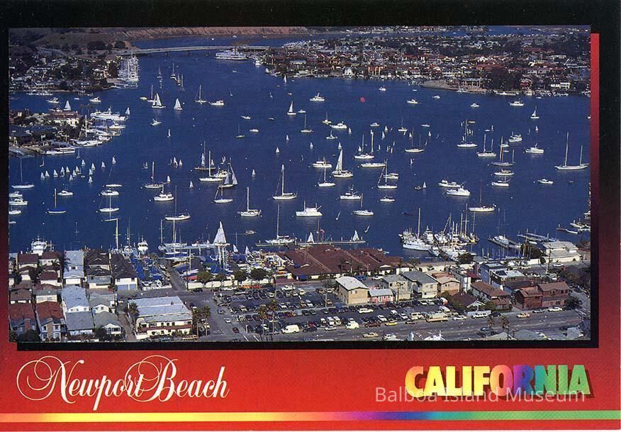 A color aerial postcard of Newport Harbor at the entrance to the upper bay. There are a number of moored and moving sailboats and boats. Harbor Island is on the right and the bottom edge of Lido is on the left. The Upper Newport Bay Bridge is along the top of the photograph with the Reuben E. Lee on the right of the bridge. Black, red gradate background with a rainbow "California" and a rainbow bar along the bottom.