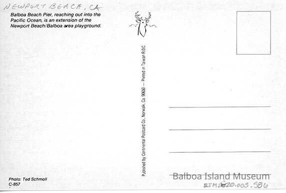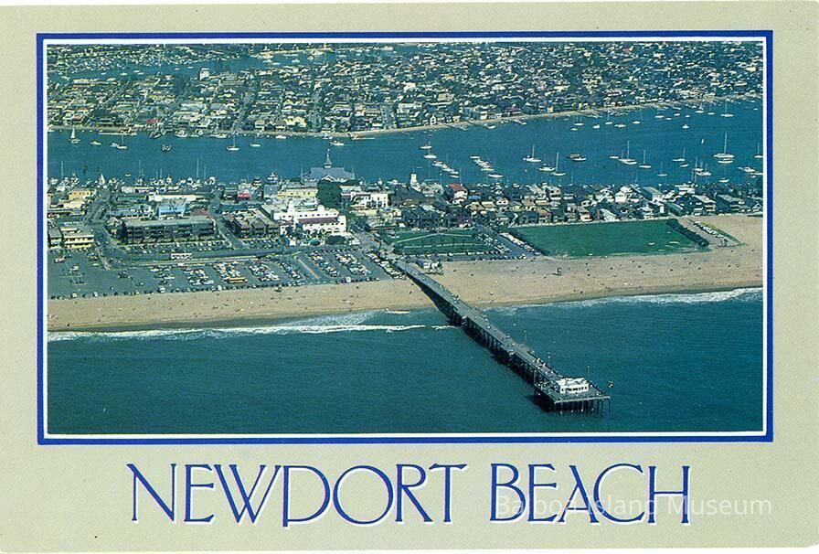 A color aerial photograph postcard of Balboa beach to either side of the Balboa Peninsula taken from the air looking towards the harbor and the Pavilion. The harbor, Pavilion, and part of Balboa Island are visible.