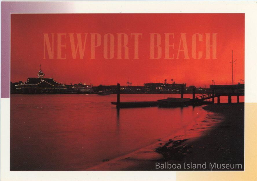 A color photograph of the Newport Harbor at Sunset taken from the Bay front beach. The Pavilion is lit up on the left. There is a white border with a purple and a tan square.