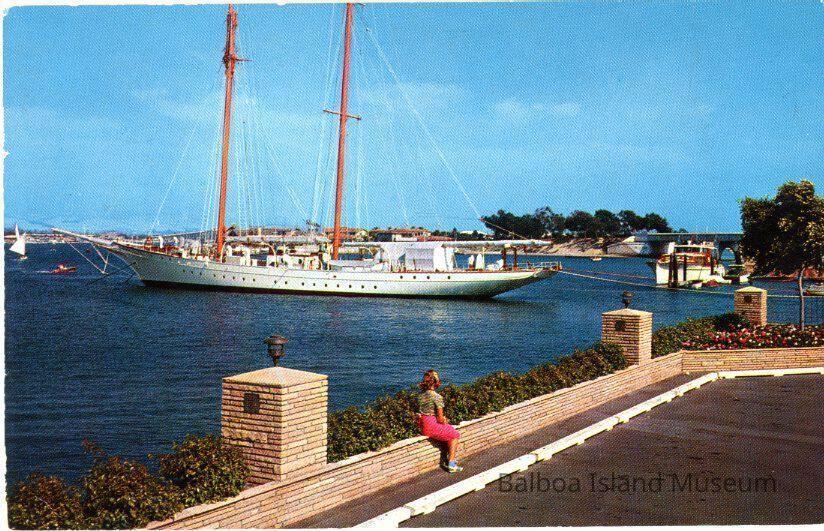 Two copies of a color postcard of a woman or girl sitting on a wall looking out at a large sailboat in the harbor. Near Lido Island.