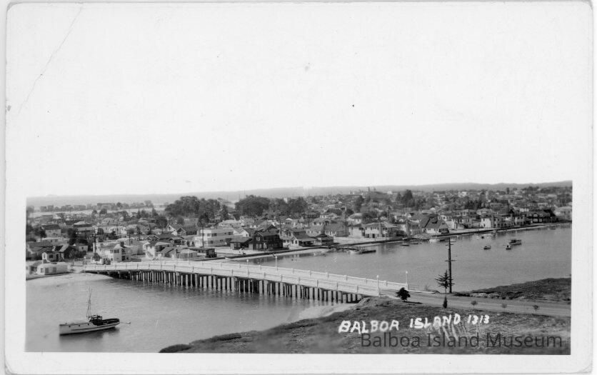 A black and white photograph postcard of the Balboa Island bridge and blocks 1300-900 of North Bay Front. There are still several undeveloped plots of land along North Bay Front and blocks half empty. The Peninsula can be seen slightly on the left side of the photograph and the ocean beyond it. The photograph was taken from the top of the hill next to Jamboree Road which is now Irvine Terrace.