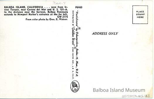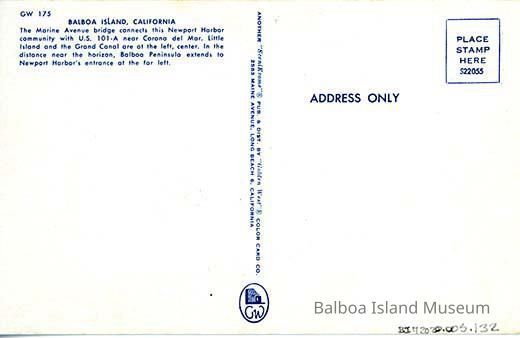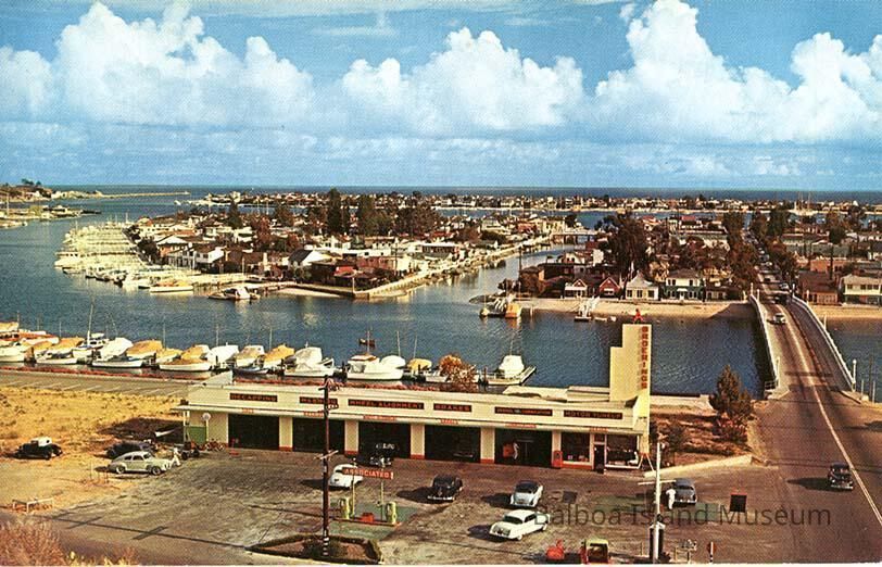 A color picture postcard featuring the Broering service station at the edge of the island with Grand Canal and Little Island behind it. The harbor entrance and Balboa Peninsula are visible along the back of the horizon.