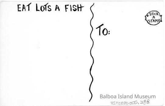Unused. Likely an advertising postcard for the Crab cooker. No listed publisher or printer. Back reads: Eat Lots A Fish. Stamp box is drawn in the shape of a fish.Subject