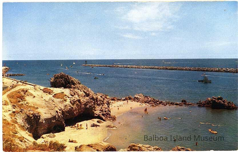 A color postcard of Smugglers Cove taken from the cliffs above looking down. Looks towards the harbor entrance. The west Jetty is visible on the right.
