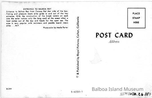 Published by Royal Pictures in Colton. Photograph by Merle Porter. Postcard number B-299. Printer number S-6235-1.Subject