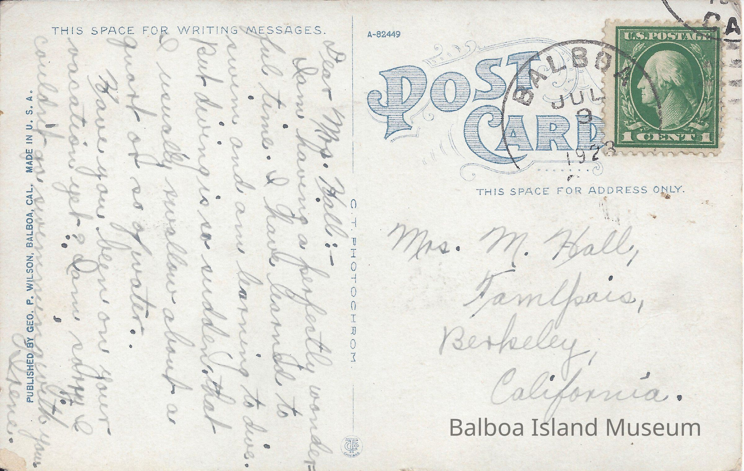 A postcard featuring a view of the Pavilion and the old slave ship, Fremont, in the bay. The card was published by Geo. P. Willison on Balboa.Lexicon