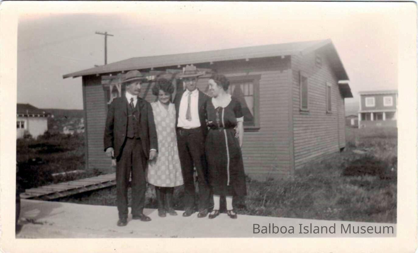 Caption by Nancy Arnett, granddaughter of Louis Perry: "People in the photo, L to R: Mr. Tusher, Lota Perry, Louis Perry, Lula Perry Larsen, in front of one of the first guest cottages built on the new island. Louis Perry build the cottage behind them at 220 Onyx Avenue in 1925. It was the third cottage built on the entire island of Balboa. That cottage stood until 2014, when it was sold and torn down to build the new structure. Louis and his family remember camping out on Balboa Island when there were no cottages and you could see clear across the island."Lexicon