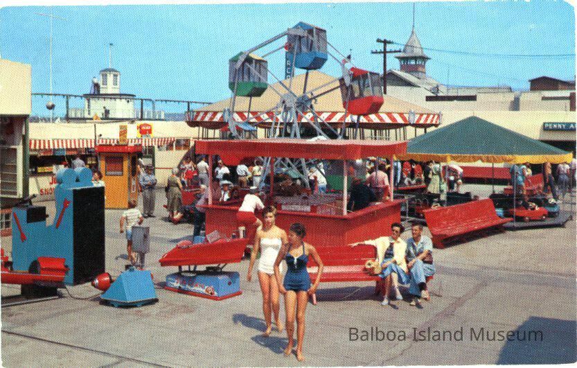 Two copies of a color postcard of people inside the fun zone with the carousel behind them, both the large and the mini one. The harbor master office and Pavilion roof are visible over the top of the buildings in the background. There is a small, closed box Farris wheel in front of the large carousel and a mechanical ride booth with three assorted amusements. The sign for the penny arcade is on the right side and a snow cone stand is on the left. The harbor master office is visible just over the back wall of shops.