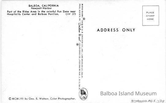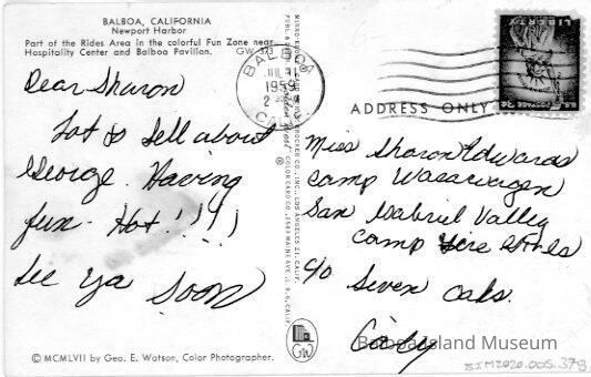 One sent and one unused. The sent card was mailed from Balboa on July 11, 1959 at 2:30 pm to Camp Wasewagan in the San Gabriel Valley. Addressed to Miss Sharon Edwards. The sender did not sign the card.