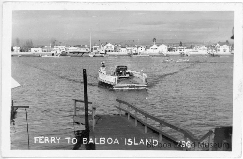 A black and white photograph of the Balboa Island Ferry coming into the Balboa Peninsula landing from Balboa island. There is one car on board. A ferry can be seen on the lift in the background in front of the boat house.