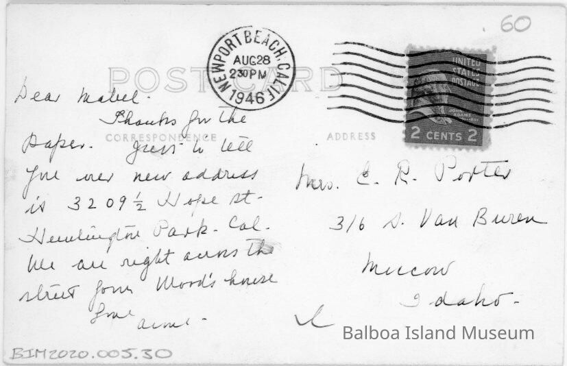There is a mesage on the back. It was sent August 28, 1946 at 2:30 pm from the Newport Beach Post Office.Subject Person/Organization