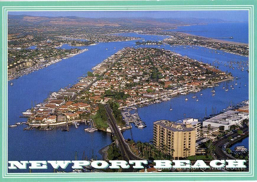 Two copies of a color aerial postcard of Lido Isle looking from over the bridge down the island. The photograph was taken from just before the entrance to the bridge on the Newport Beach side of the bridge. Alternating white and green boxes frame the image.