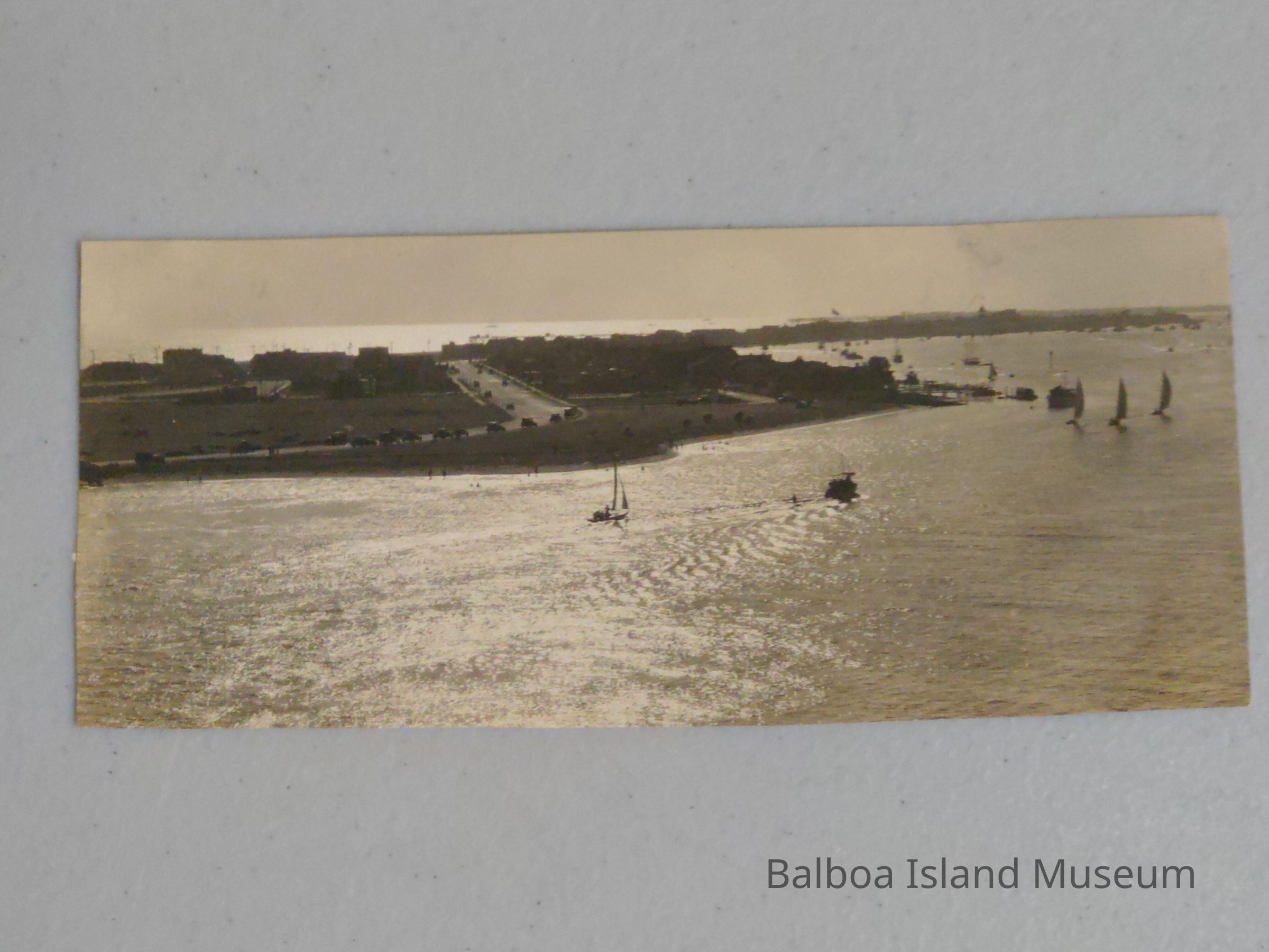 A blakc and white photograph that has been cropped down from the original size. The photograph shows the back edge of the Balboa Peninsula behind the Wedge at the point where Balboa Blvd turns into Channel Rd. There were primarily roads at this time with little in the way of houses, though more are visible towards the ocean side of the Peninsula. There are beach goers in the water along the shore. and a number of sailboats in the harbor. Circa 1930s.Photograph Details