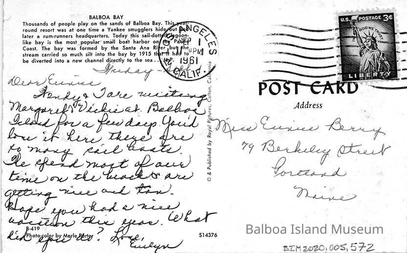 Sent on September 1, 1961 at 11PM. Sent to Miss Eunice Berry in Portland, Maine from Evelyn in Los Angeles.