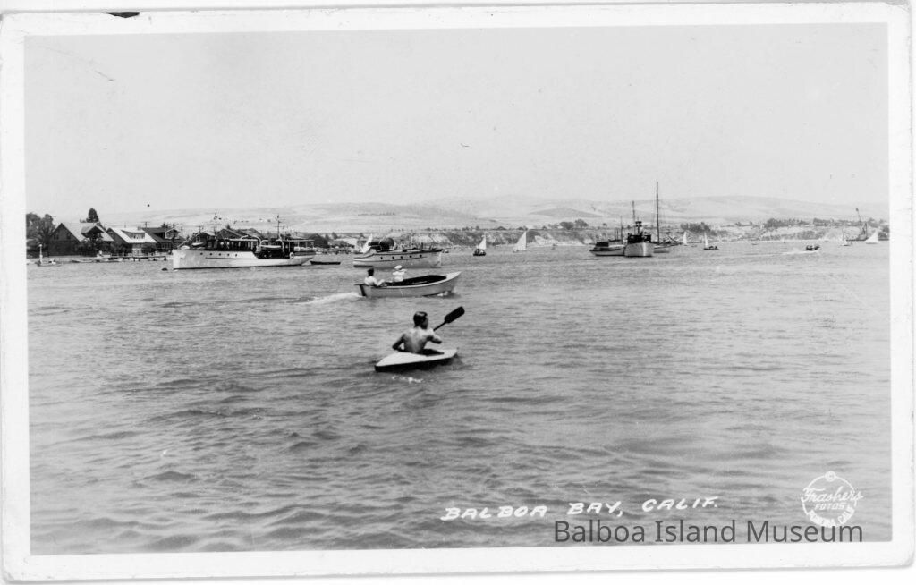 A sepia photograph of the Newport Harbor from on the water. 526 to 530 South Bay Front Balboa Island are to the left with the hills and Bayside along the back of the photograph. There is a kayaker in the foreground with a motorboat passing in front of him.